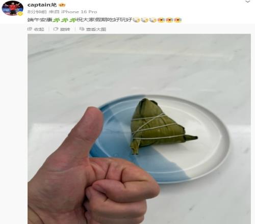 马龙晒出了一张粽子照片并配文写道:“端午安康,祝大家假期吃好玩好!”