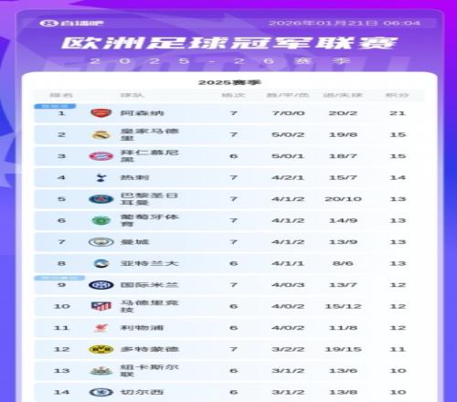 目前6支英超球队的欧冠排名依次为:阿森纳榜首,热刺第四,曼城第七,利物浦第十一,纽卡第十三,切尔西第十四。